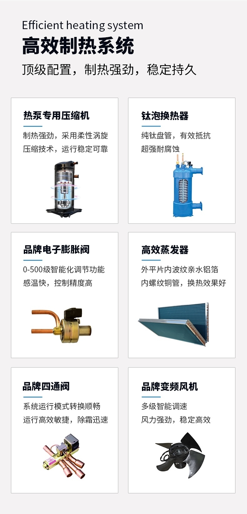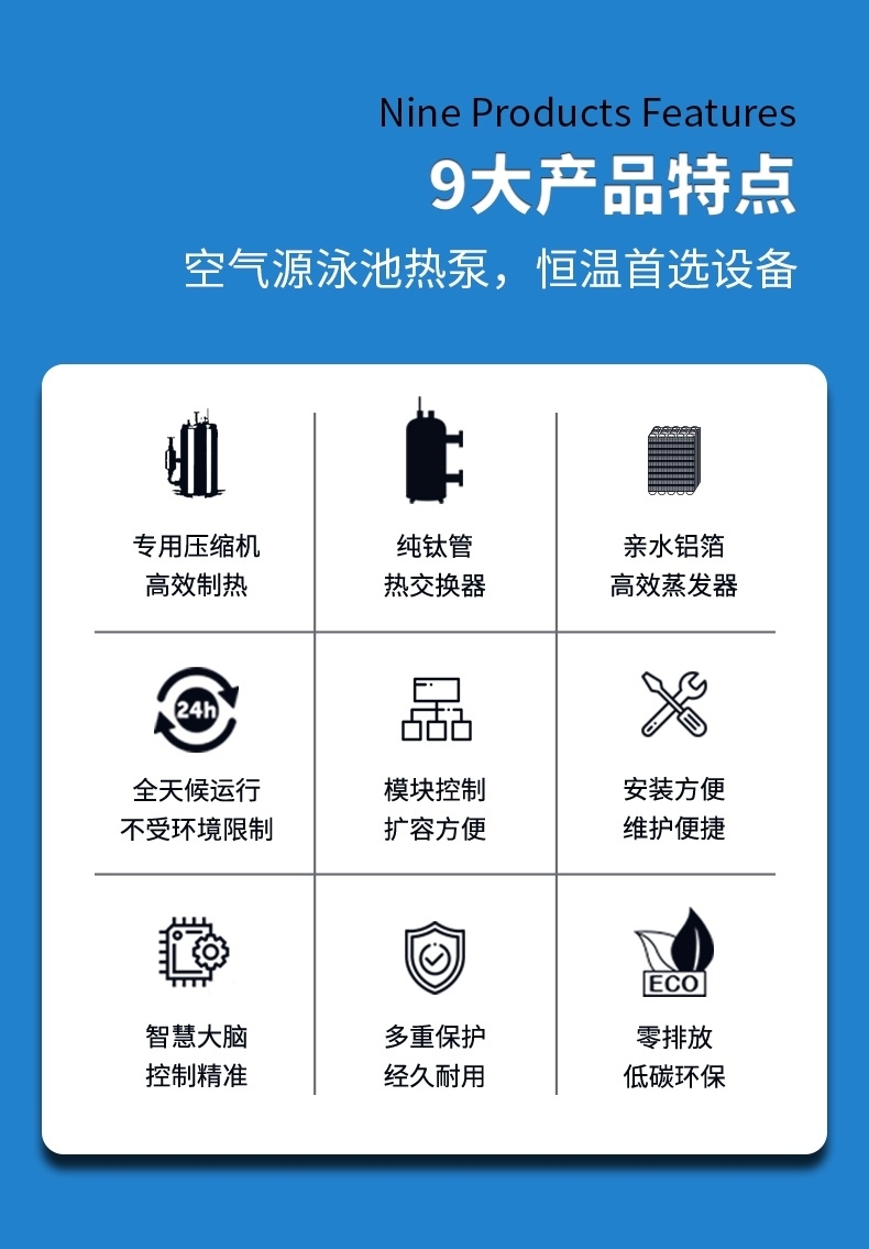 机组型号规格齐全,适用于各种大小的家用、别墅、商用泳池。对于大型泳池,可根据实际负荷大小进行模块拼装组合。贝克斯桑拿·温泉·泳池热泵加热恒温循环热泵机组采用国际知名品牌的热泵专用压缩机,应用柔性涡旋技术,可以适应恶劣的环境,有效保障产品的长期使用寿命。因为采用了航空材料“钛合金”换热器,所以耐腐蚀性非常强。