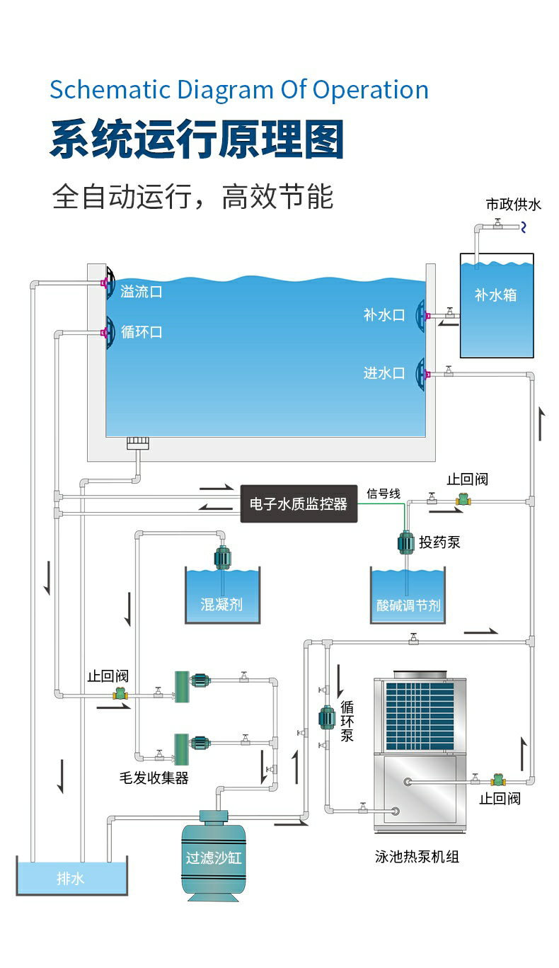 贝克斯恒温循环机组,对热水量需求多的用户以足够的支持。整体式设计,结构紧凑,外形美观,占用空间小,安装方便灵活。水电隔离,无燃烧、不漏电、不漏气、无污染,大大降低触电、中毒、爆炸等危险,使用安全环保。采用热泵技术,机组直接加热泳池水,与传统锅炉+板式换热器的加热方式相比,运行费用可节省65%-80%。